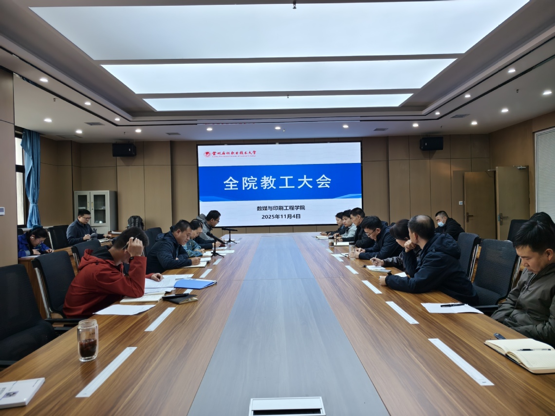 2025年11月4日下午,数媒与印刷工程学院在第三工业中心九楼会议室召开全院教职工大会。会议由学院负责人主持,全体教职工参会,围绕政治理论学习、国际学术讲座、办学能力评价、毕设中期检查、加强教学管理与实训室安全检查等近期重点工作进行安排部署。